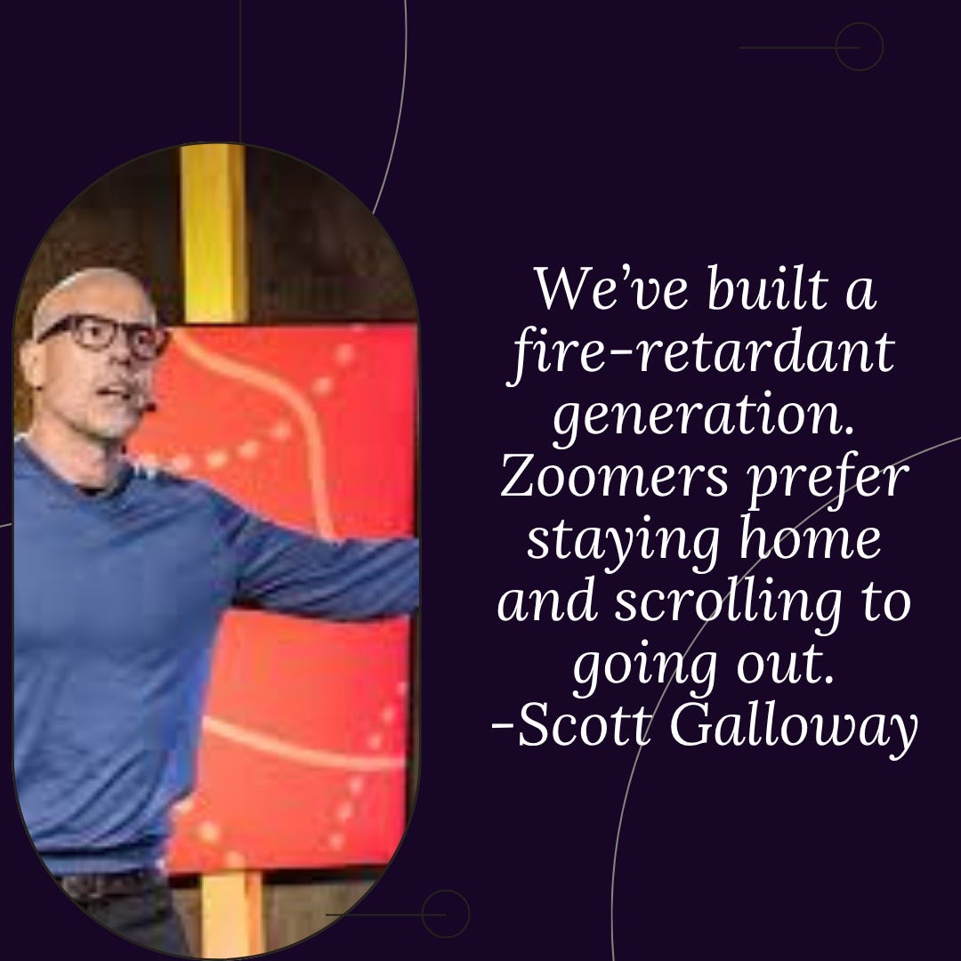 Without this fire, our species goes out of business. Unfortunately, we’ve built a fire-retardant generation. Zoomers prefer staying home and scrolling to going out, and when they do venture out, they’re less likely to visit a bar, reducing the chances they’ll make a series of bad decisions that might pay off.